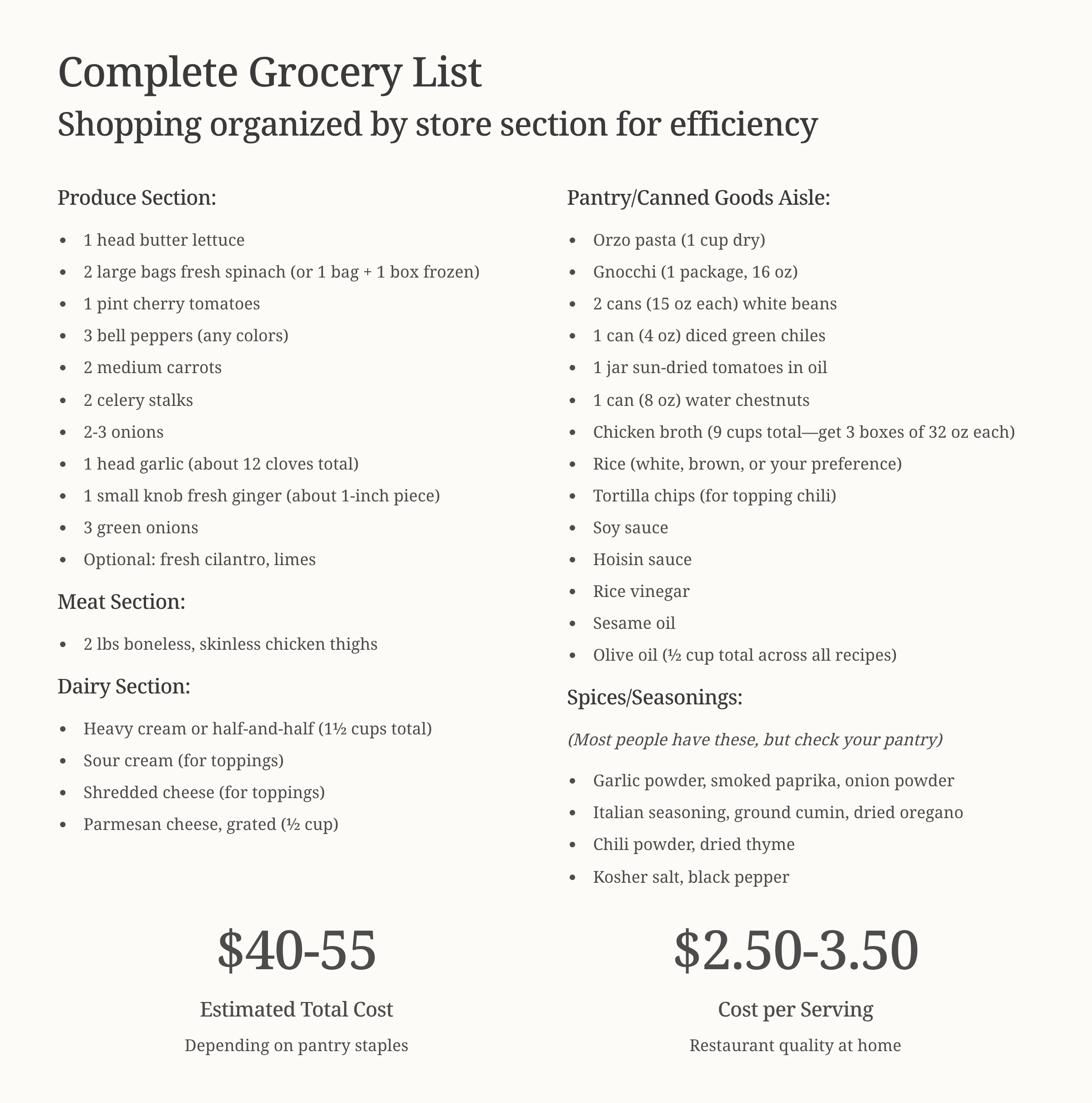 The week starts rich and creamy (Tuscan orzo), moves through hearty comfort (chili, fajitas, gnocchi soup), and ends light and fresh (lettuce wraps). That’s intentional—it matches how your energy and appetite shift through the week.