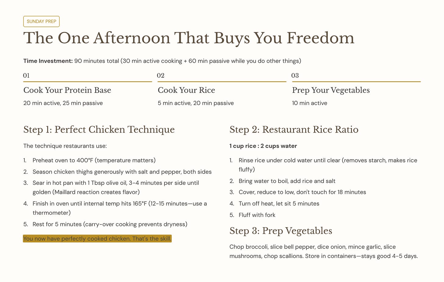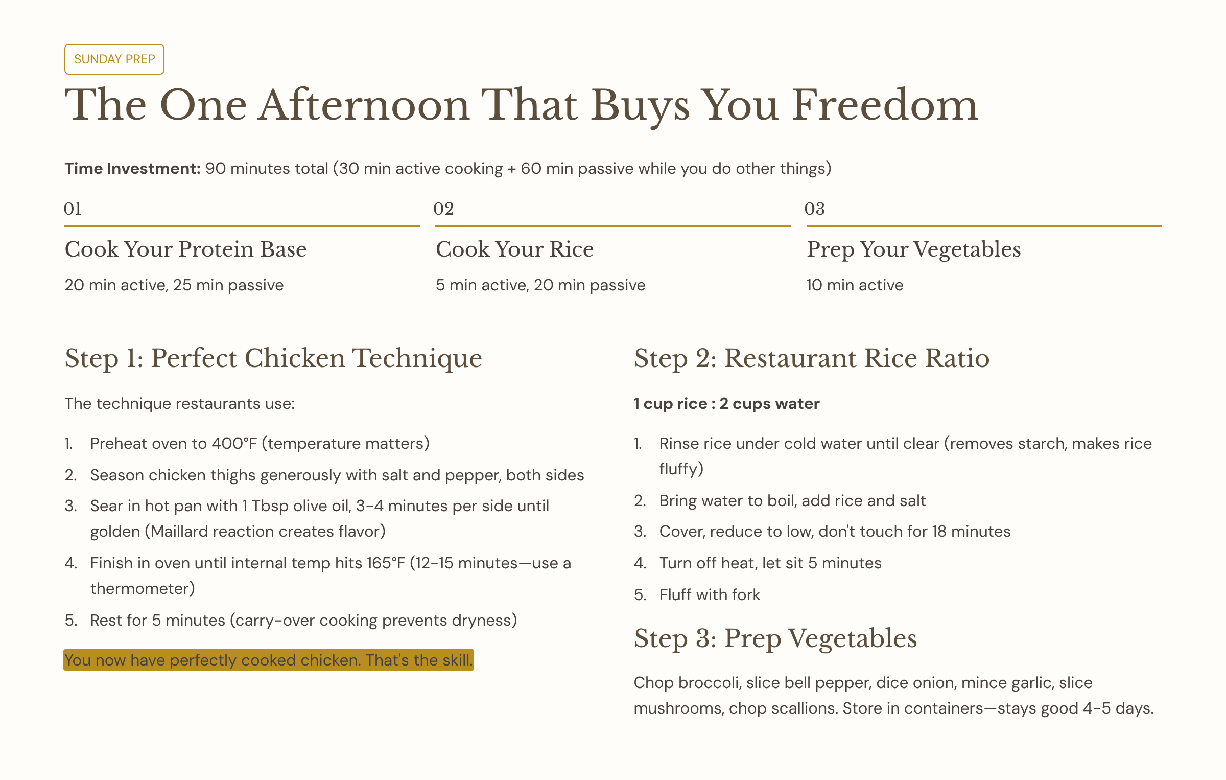 You’re learning professional cooking technique. How to cook protein properly. How to build flavor. How to prep once and eat four completely different meals.