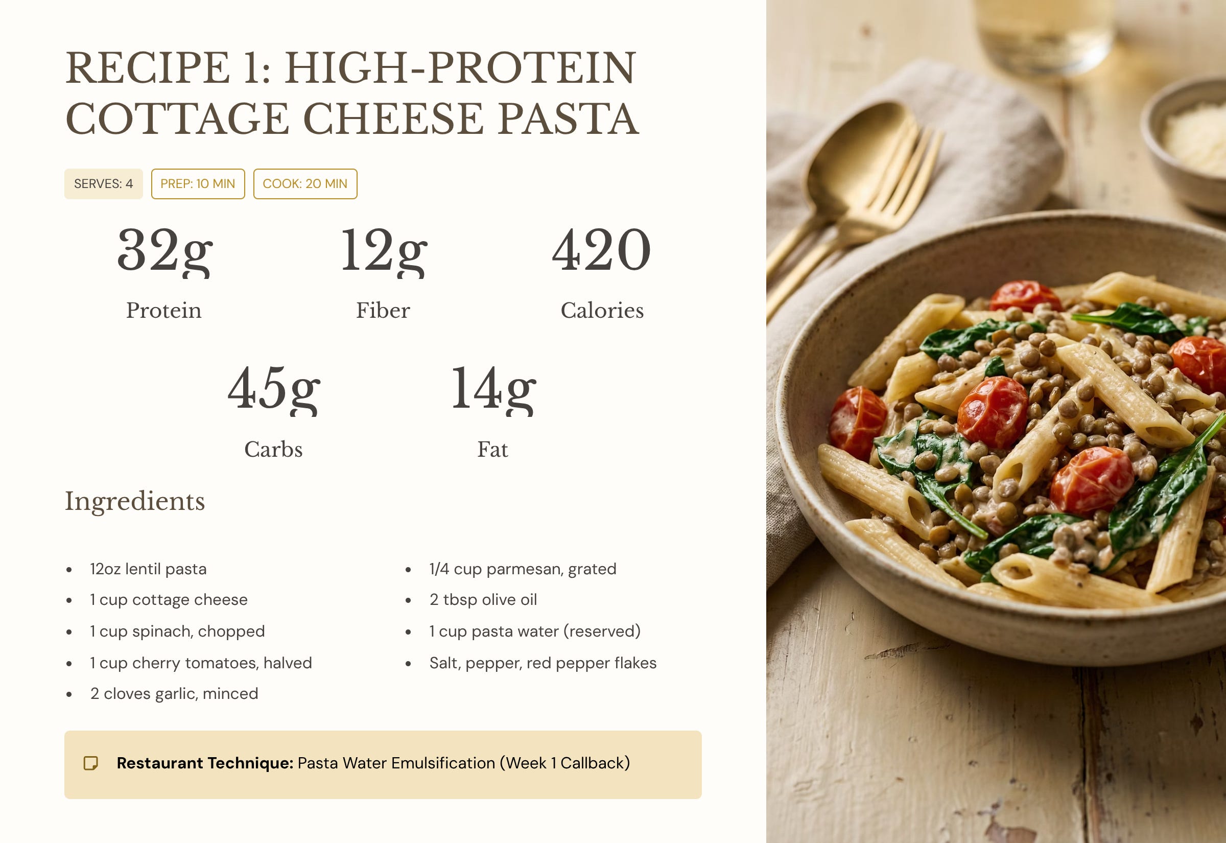 It uses Week 1 techniques. If you followed last week, you already know pasta water emulsification. This just adds a protein boost.
